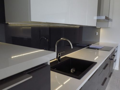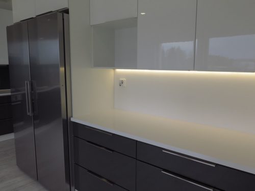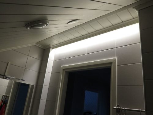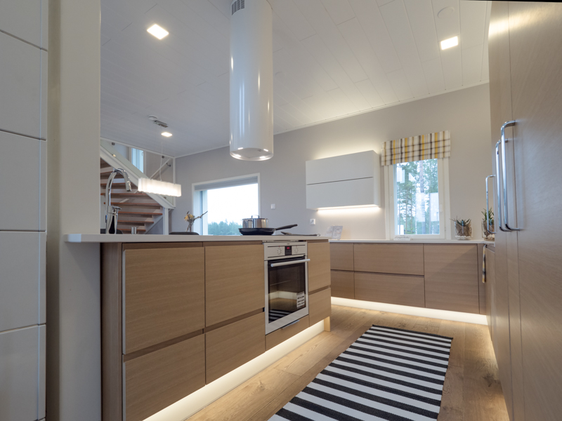 Yleensä keittiön valaistus toteutetaan yläkaapin alapintaan asennetulla led-nauhalla, mutta sitä voi myös laajentaa kaapin päälle, jolloin valo heijastuu katon kautta pehmeästi koko tilaan.
